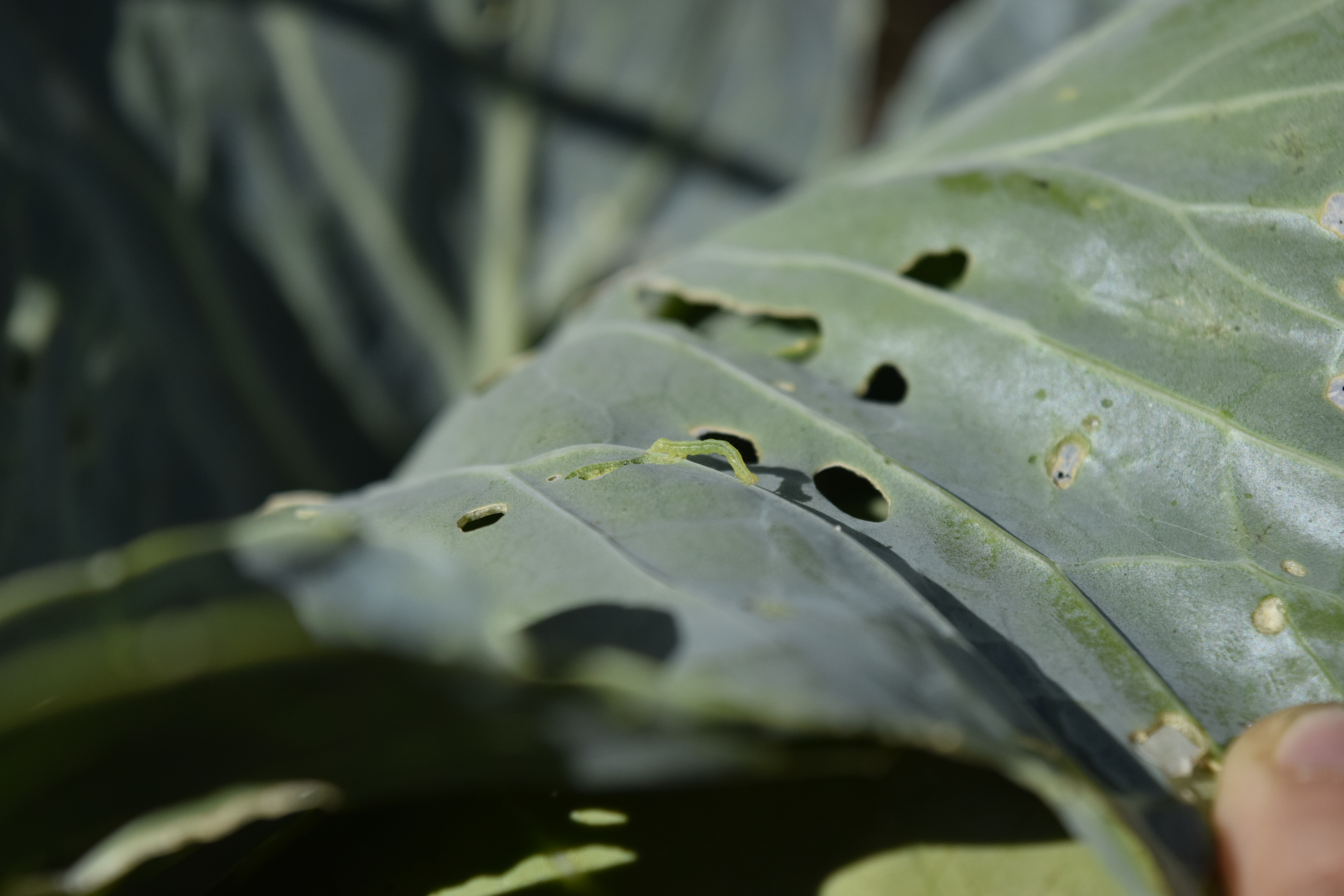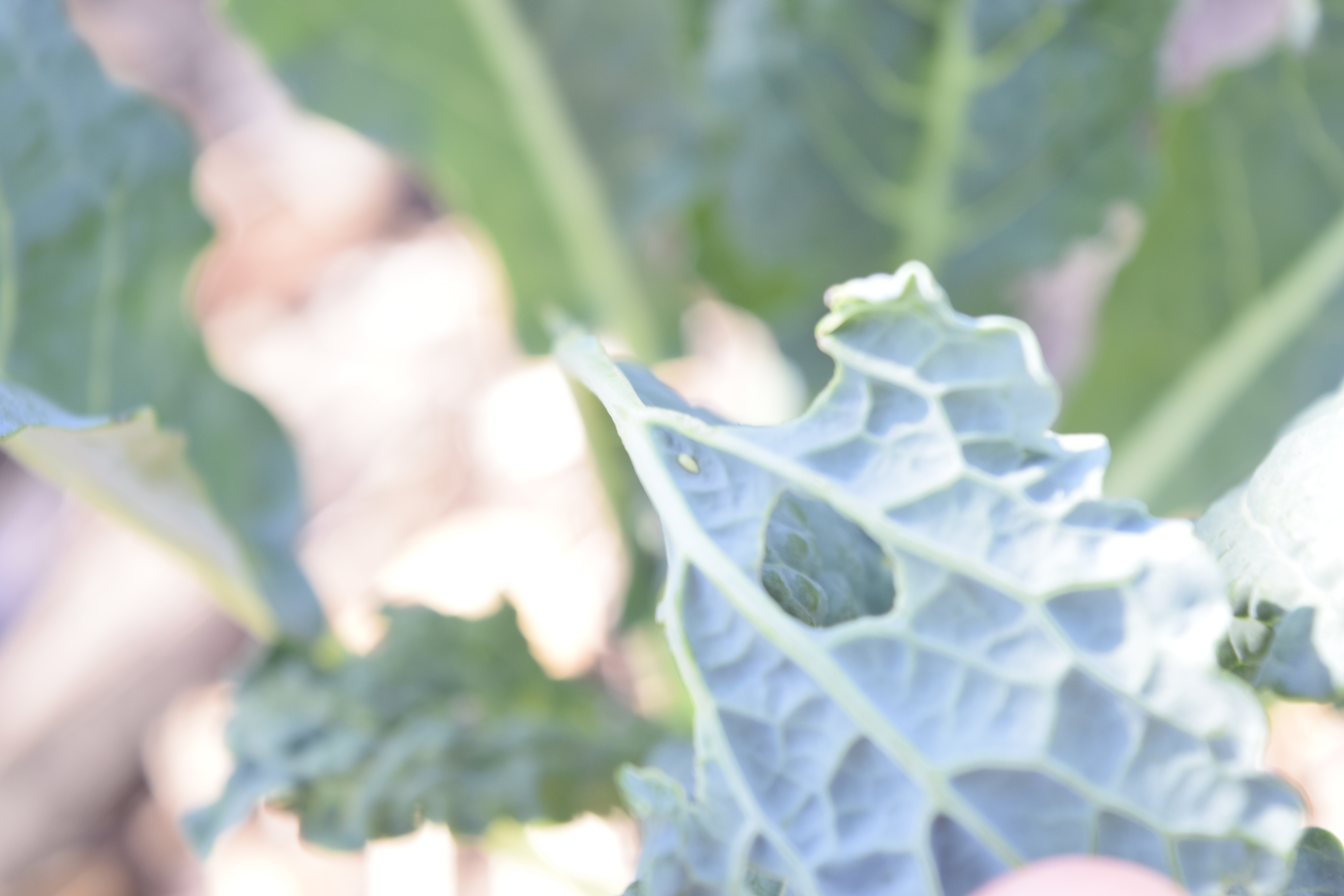 Despite all our efforts, finding these little green buggers on our brassicas is inevitable. The last resort in our multi-prong approach is looking for the caterpillars on the plants and squishing them, feeding them to chickens (or quail), or drowning them in a bucket of water. PS: I totally use gloves for squishing or throw them on the ground and step on them. Since cabbage caterpillars are green, they blend in very well and are hard to spot. Start by looking for holes in the leaves or caterpillar poops. These are the best indicators that a caterpillar is nearby.