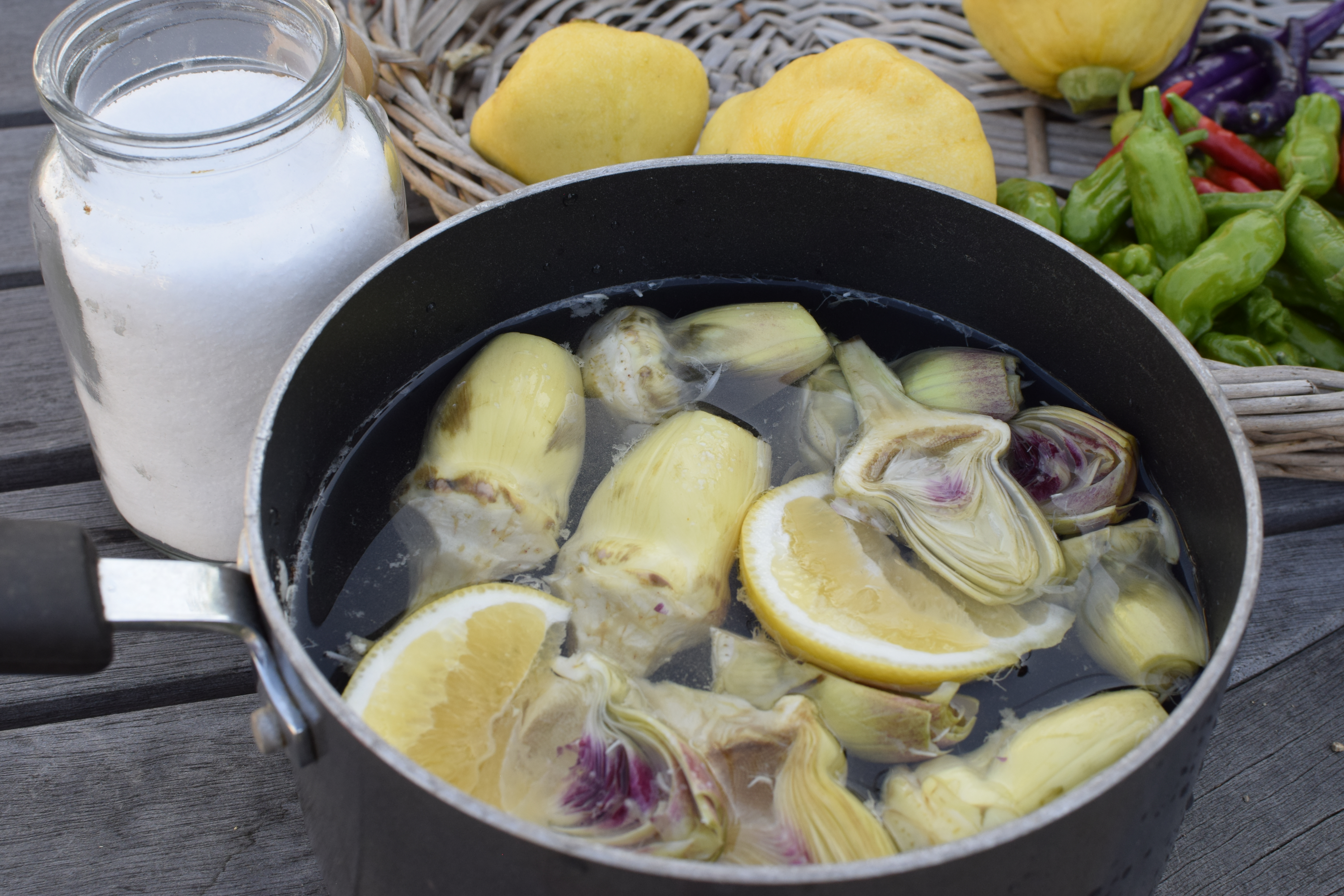 *this recipe is basic and instinctive, hence the lack of measurments. Since you never know how many artichokes will be coming out of the garden, I’m giving you our basic process.