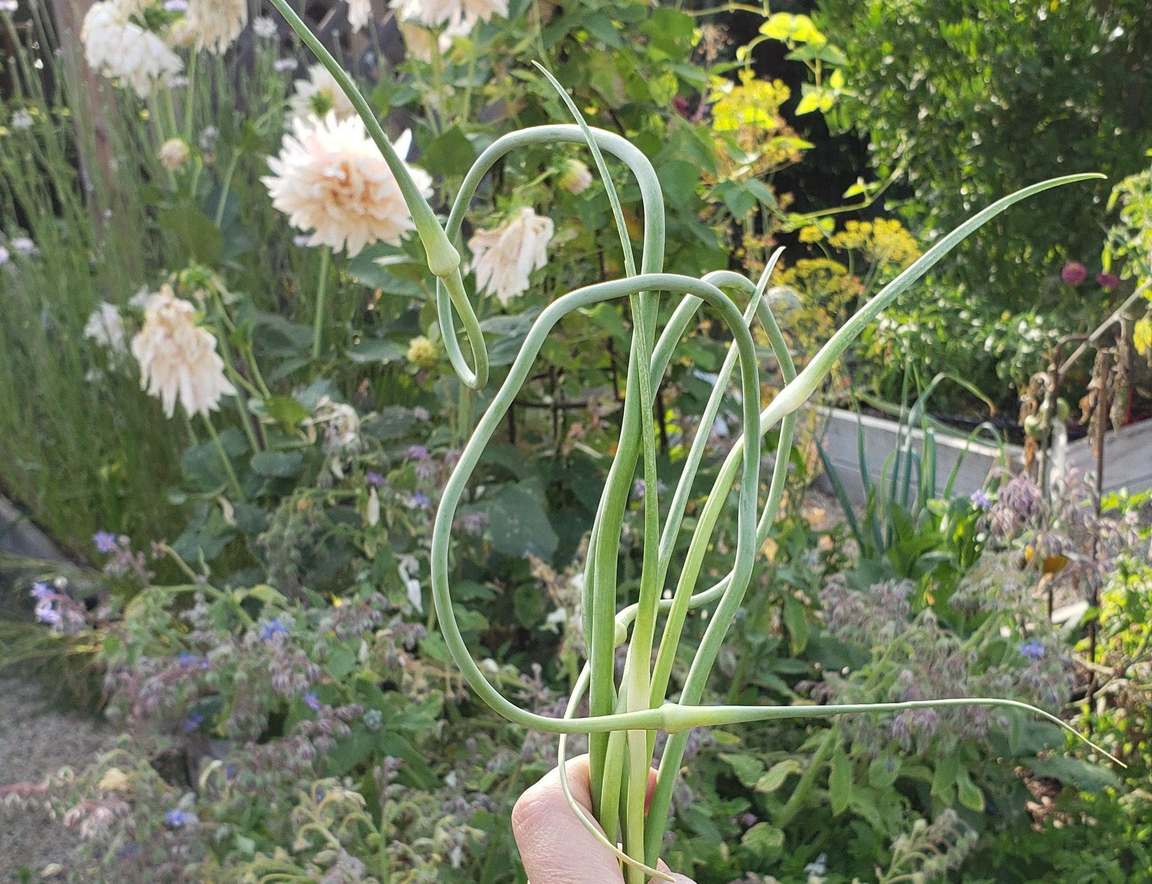 Braiding or plaiting garlic is best done with softneck garlic. As the name implies, hardneck garlic develops a stiff neck (as a result of the scape stem) that can’t be braided. I still bundle mine in a cute-fashion and tie with twine.