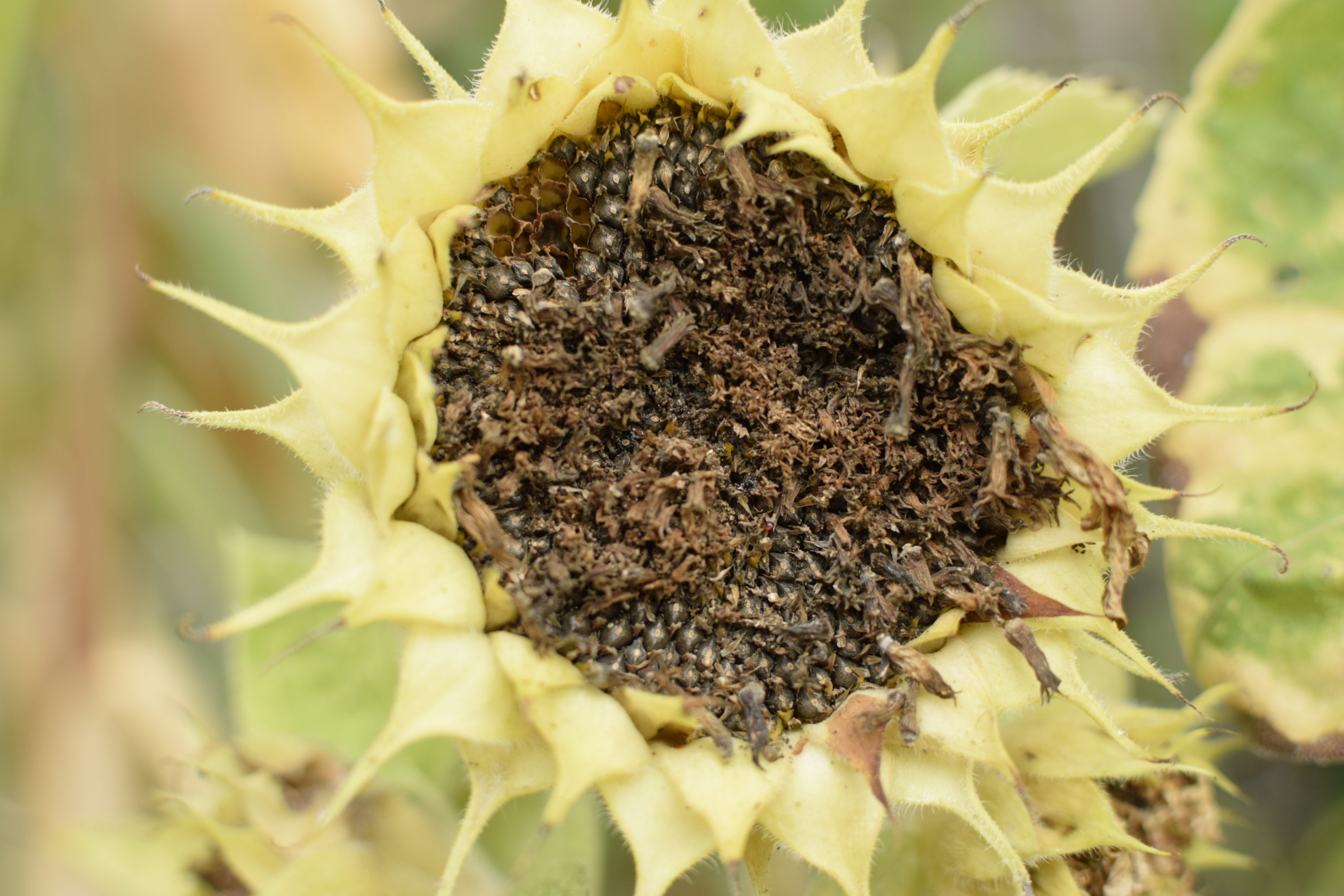 When it is time to harvest the seeds, simply take a gloved hand (I say “gloved” because there are some spiky bits in the dried head sometimes), and gently brush your fingers over the head to reveal and loosen the seeds. Always store seeds away from any moisture and keep in a cool, dark place.