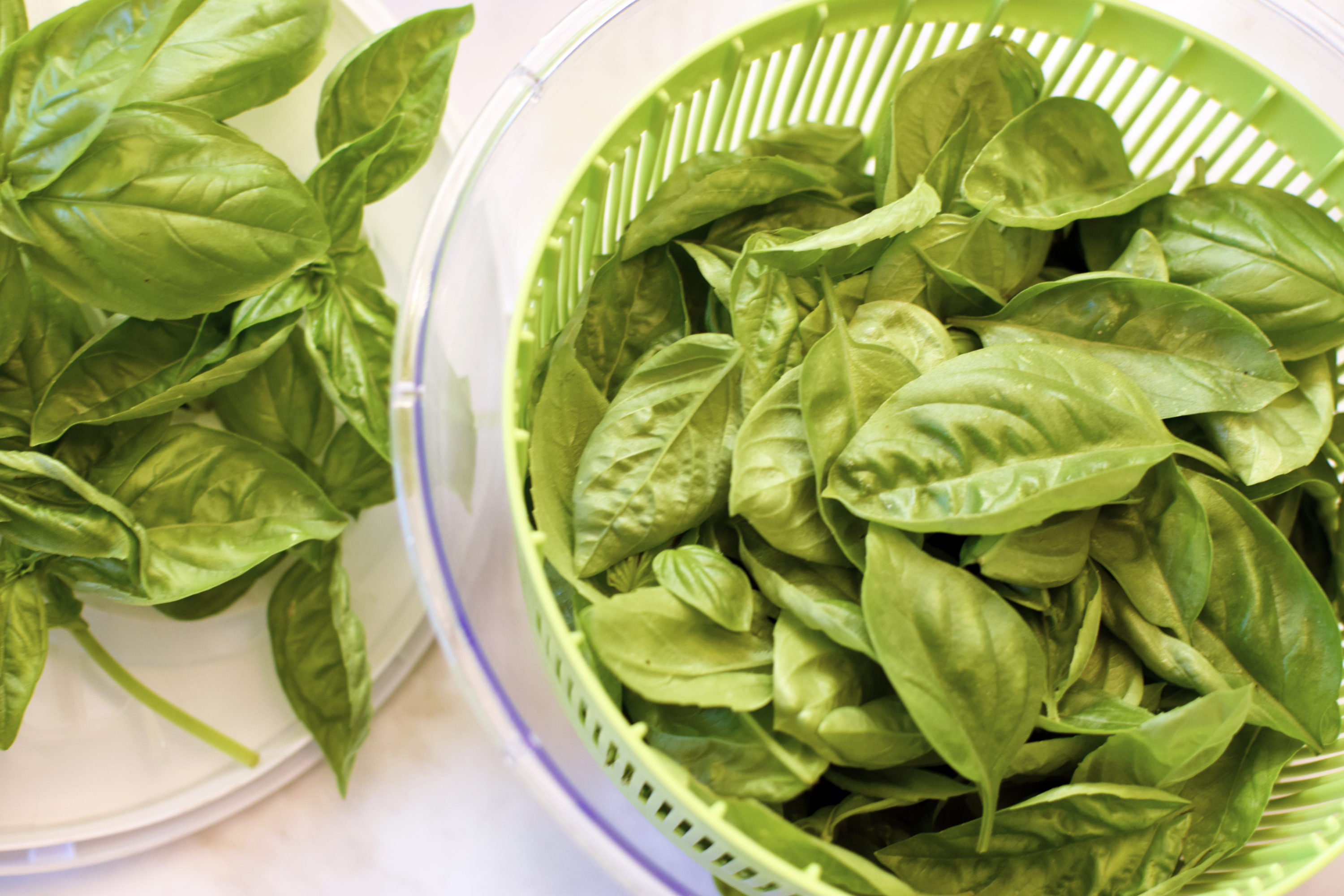 Pull your basil leaves off (don’t dehdryate the stems) and put them in a colander or salad spinner to be washed.