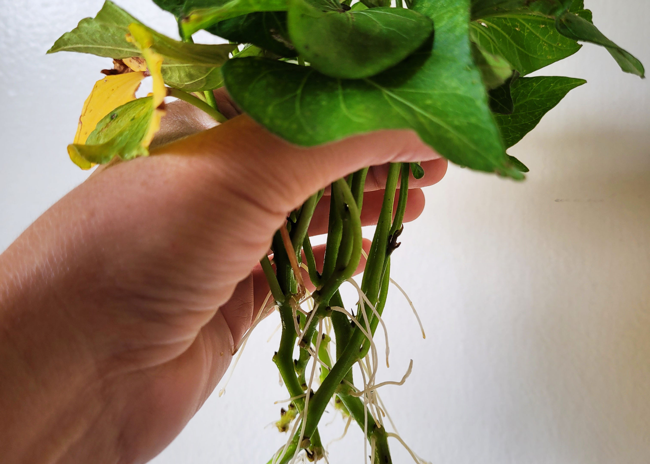 Wait at least 3-4 weeks before checking on your cuttings. Honestly, I completely forget about them until one day I look over and notice they aren’t dead. After almost a month, the top leaves might have wilted (or maybe not!) but what’s important to look for is signs of life. Are there little leaves coming out of a leaf node? Are the top leaves alive (a good sign roots are establishing)? Does the stem look healthy in color? Or does it look rotted/brown?