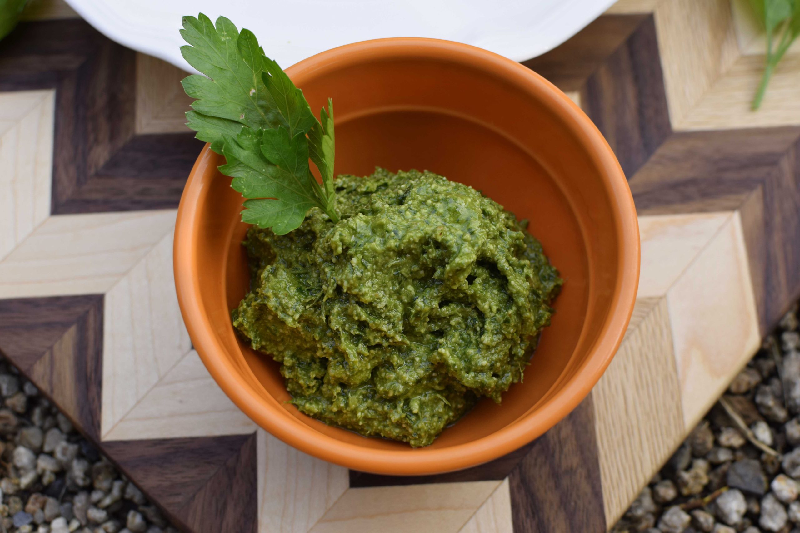 While the flavor of parsley is a little difficult to describe, there’s definitely a “green” flavor to it along with an earthy quality and sweet smell. Therefore, this pesto makes a great condiment for roasted potatoes, vegetables, meats, and even pasta. This recipe is not meant to replace or replicate the flavor of basil pesto—truthfully “pesto” simply refers to the action of crushing or mashing—but it uses a whole lotta parsely to create a condiment that has many uses.