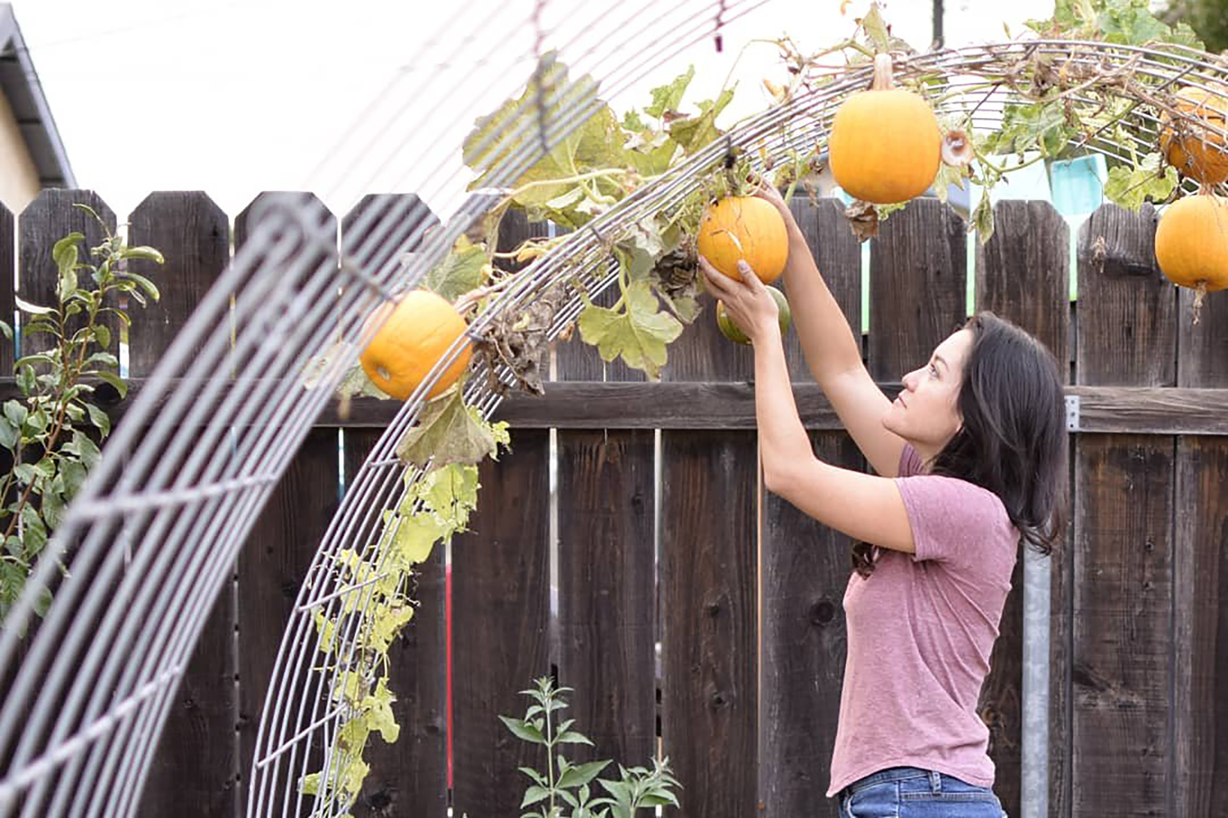 For example, one year I grew mini sugar pumpkins on my cattle panel trellises like in the photo below. Be sure to check out my Vertical Growing Guide for more inspiration!