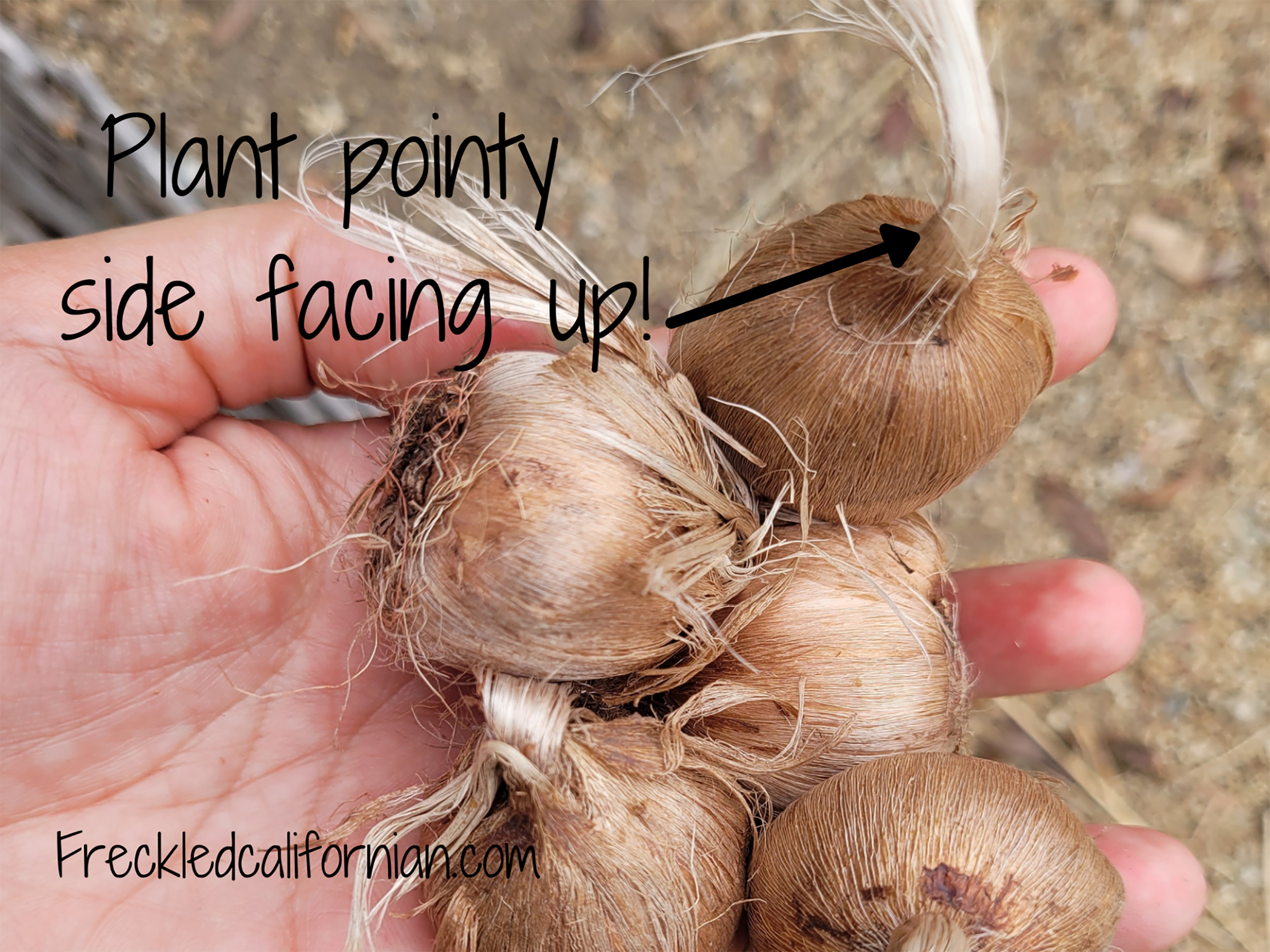 Once your planting area is prepared for growing saffron (you can read more tips for how I amend soil HERE), you simply plant your corms so that 2 inches of soil covers the tops of the corms. Make sure to plant them pointy part facing up!