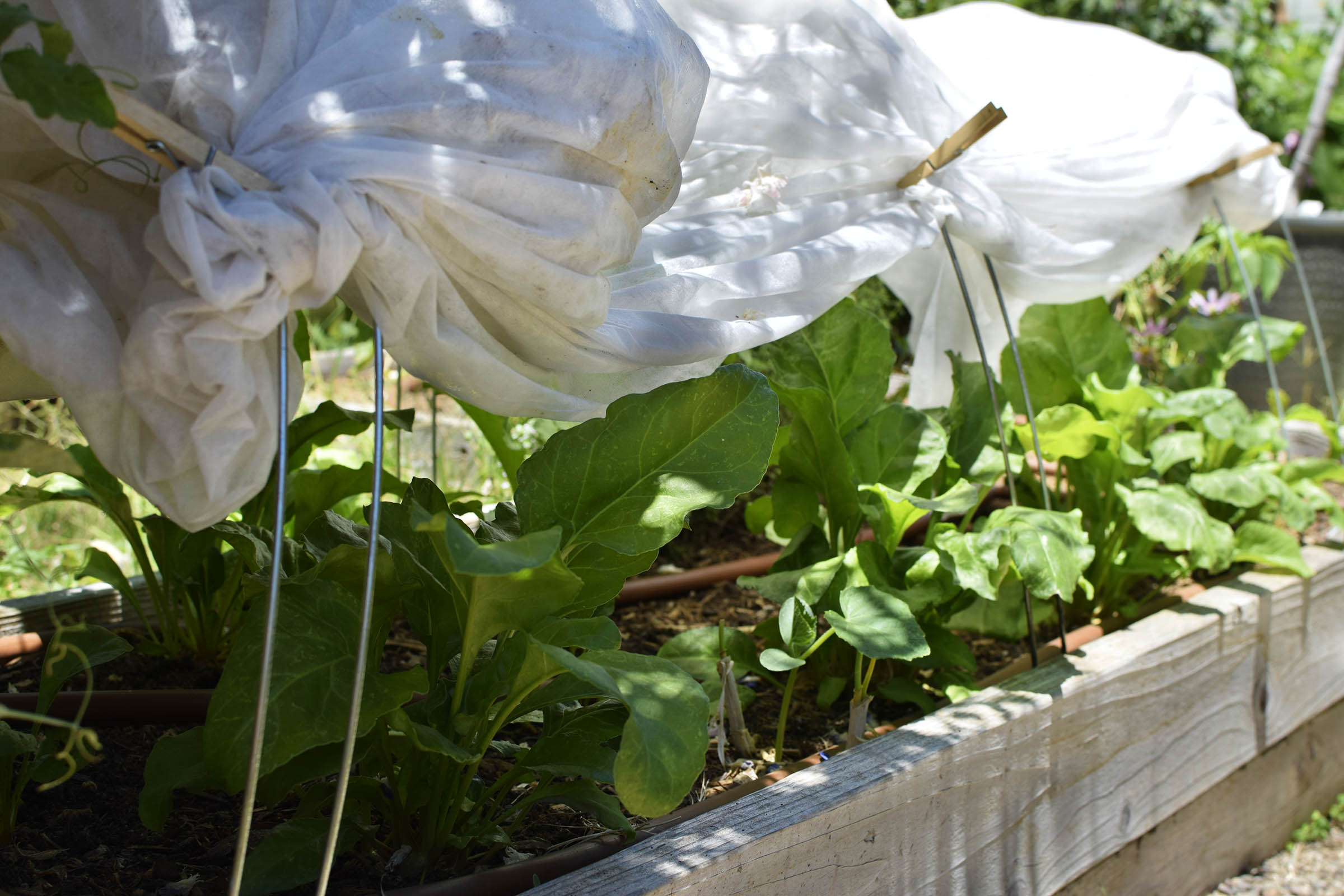 Lately I’ve been switching between both. On days in the 70s I use my fabric row cover to get maximum light, and on hotter days I use the shade cloth to keep things cooler. What helps is that my DIY hoops are already installed, so it’s simply a matter of changing out the material.