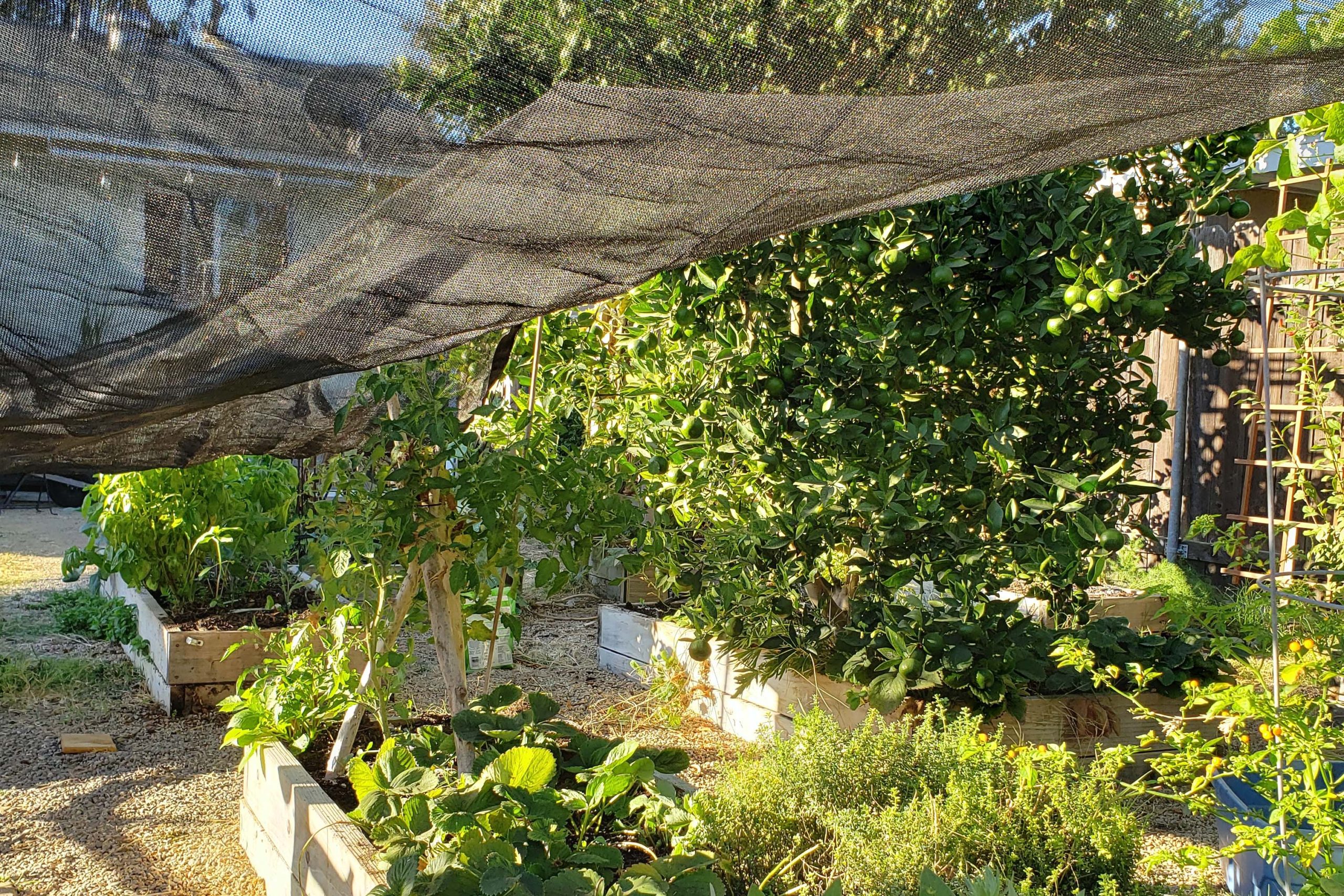 It is possible to use the shade cloth strung up above your garden to shield your crops from the hottest afternoon sun, while using row cover over your actual garden beds/crops. This combo seems very useful because temperatures below shade cloth are impressively cooler (especially with airflow all around), except for the fact that I don’t really have the structures in place to do this on a semi-permanent basis. Hanging shade cloth can also be cumbersome in high winds which we do get here in Fall (hello santa ana winds!).
