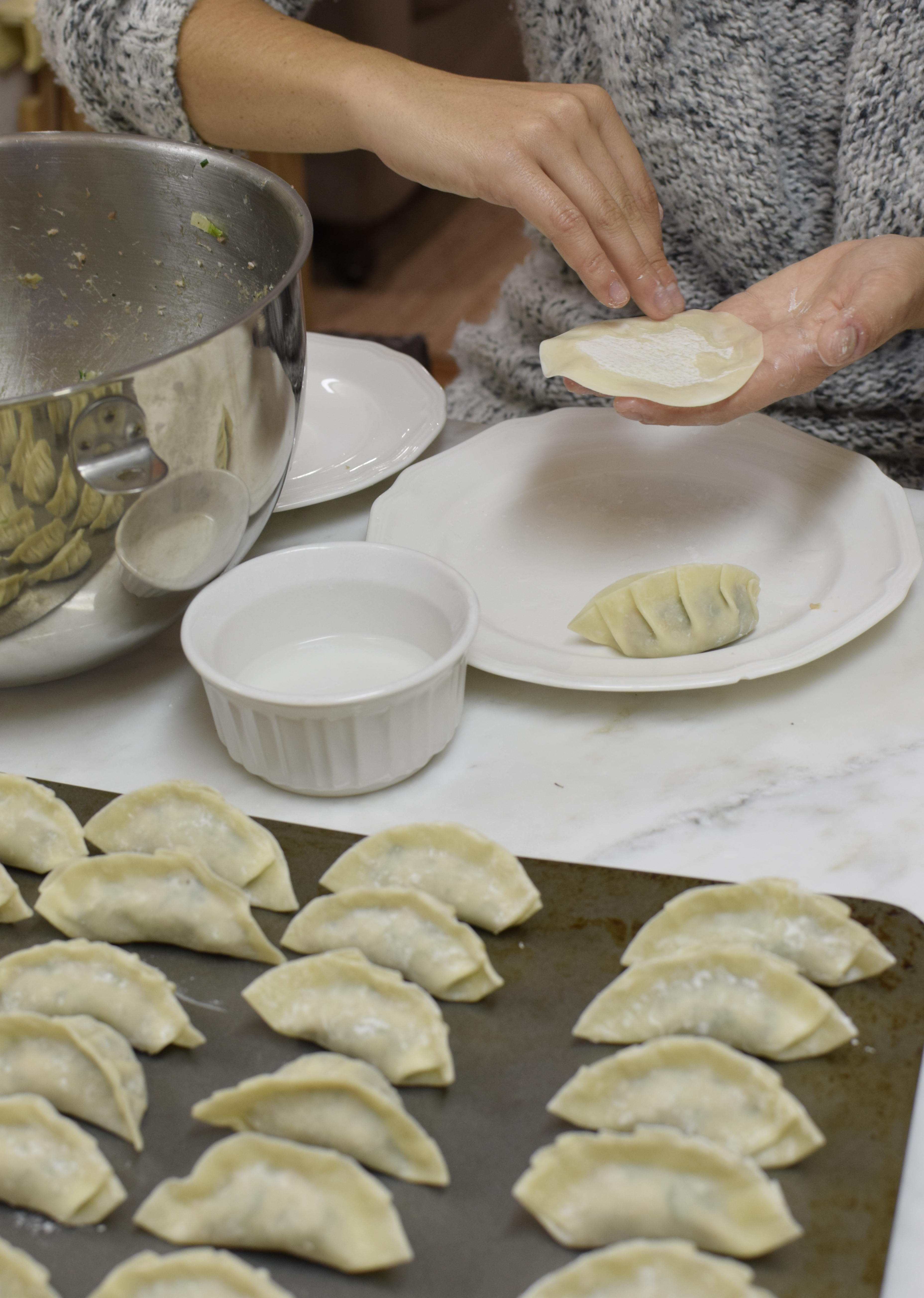 Take your gyoza wrapper, add about a teaspoon-tablespoon of filling to the center (you’ll start to get comfortable with how much filling works for you). Dip your finger in the bowl of water and moisten around the edge of the wrapper. At this point you can do a traditional dumpling fold, or you can just fold in half to seal. I think the dumping folds are fun, but it’s not something that can really be described in writing. I highly encourage you to find a video on YouTube on how to fold gyozas. ***We don’t take this too seriously, and each of our gyozas turn out a little different. That’s okay!