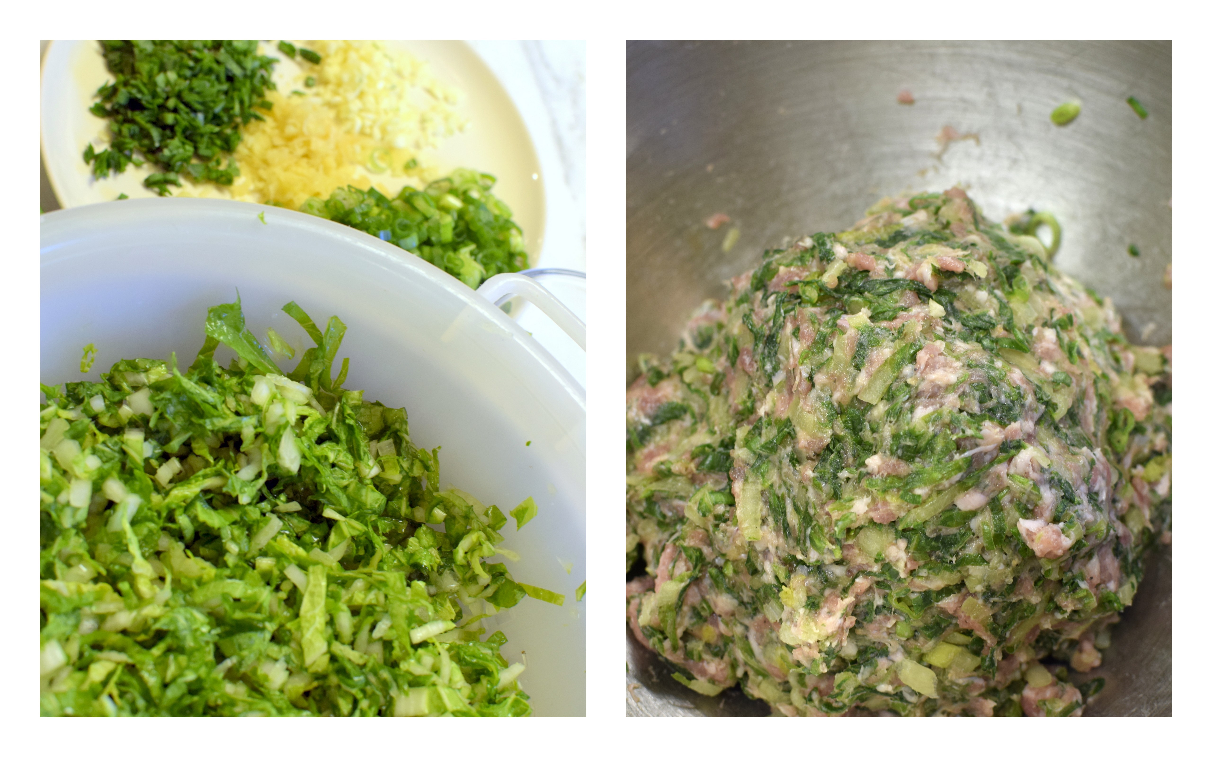 Place the finely minced napa cabbage in a colander over a large bowl. I usually don’t use the thick bottom stem parts (those can be used for future stir fries or composted). Sprinkle only 2 teaspoons kosher salt (one of the teaspoons is reserved for later) over the cabbage and massage gently with your hands. Let it sit for about 15 minutes. The cabbage will loose a lot of liquid down in the bowl. We don’t want this liquid in the gyozas because it will make the filling and wrappers soggy.