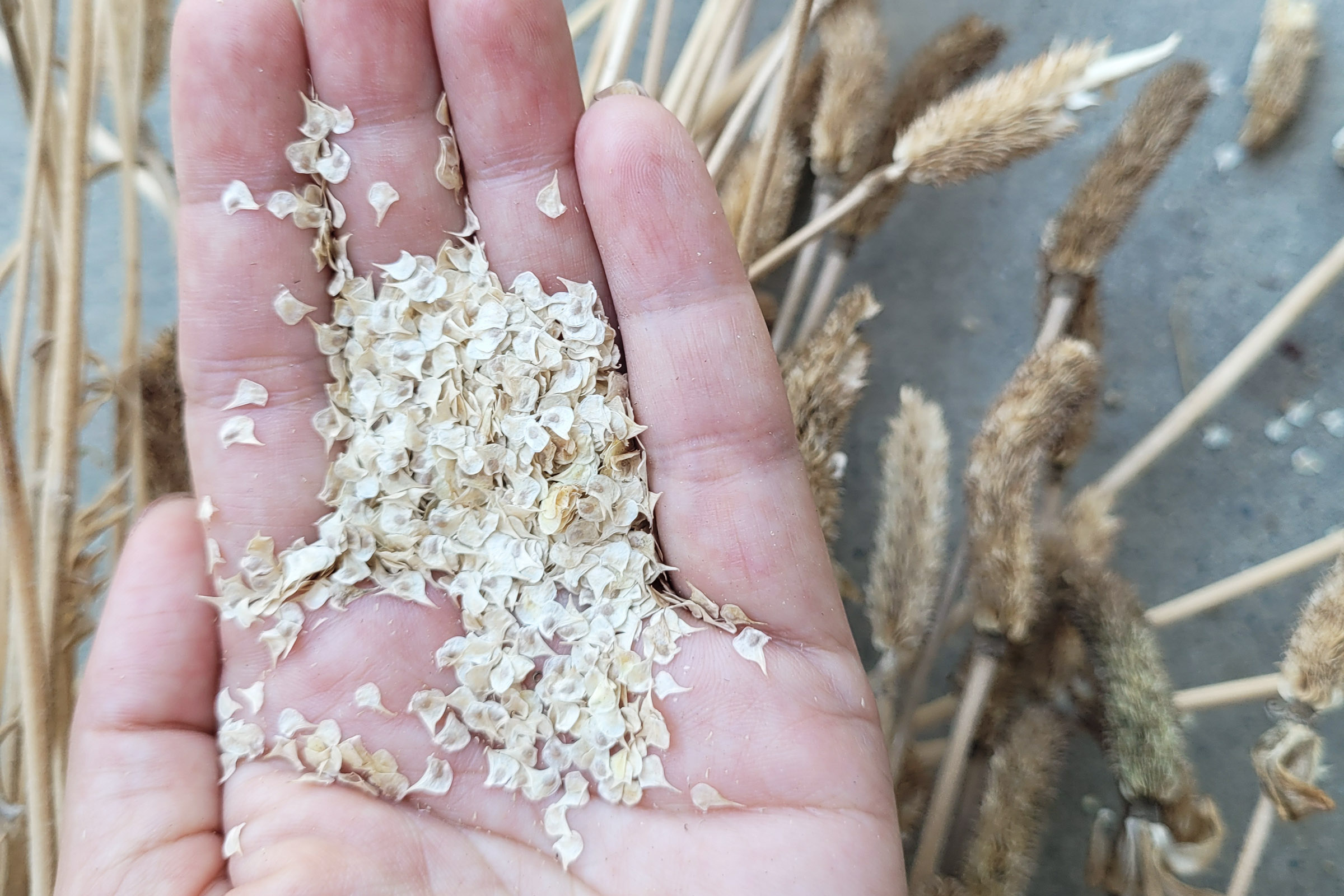 Once you have dried seeds heads, simply run your fingers over the dried seed heads to loosen the seeds. Do this over a paper bag so that all those little flakes fall into the bag and not all over the place.