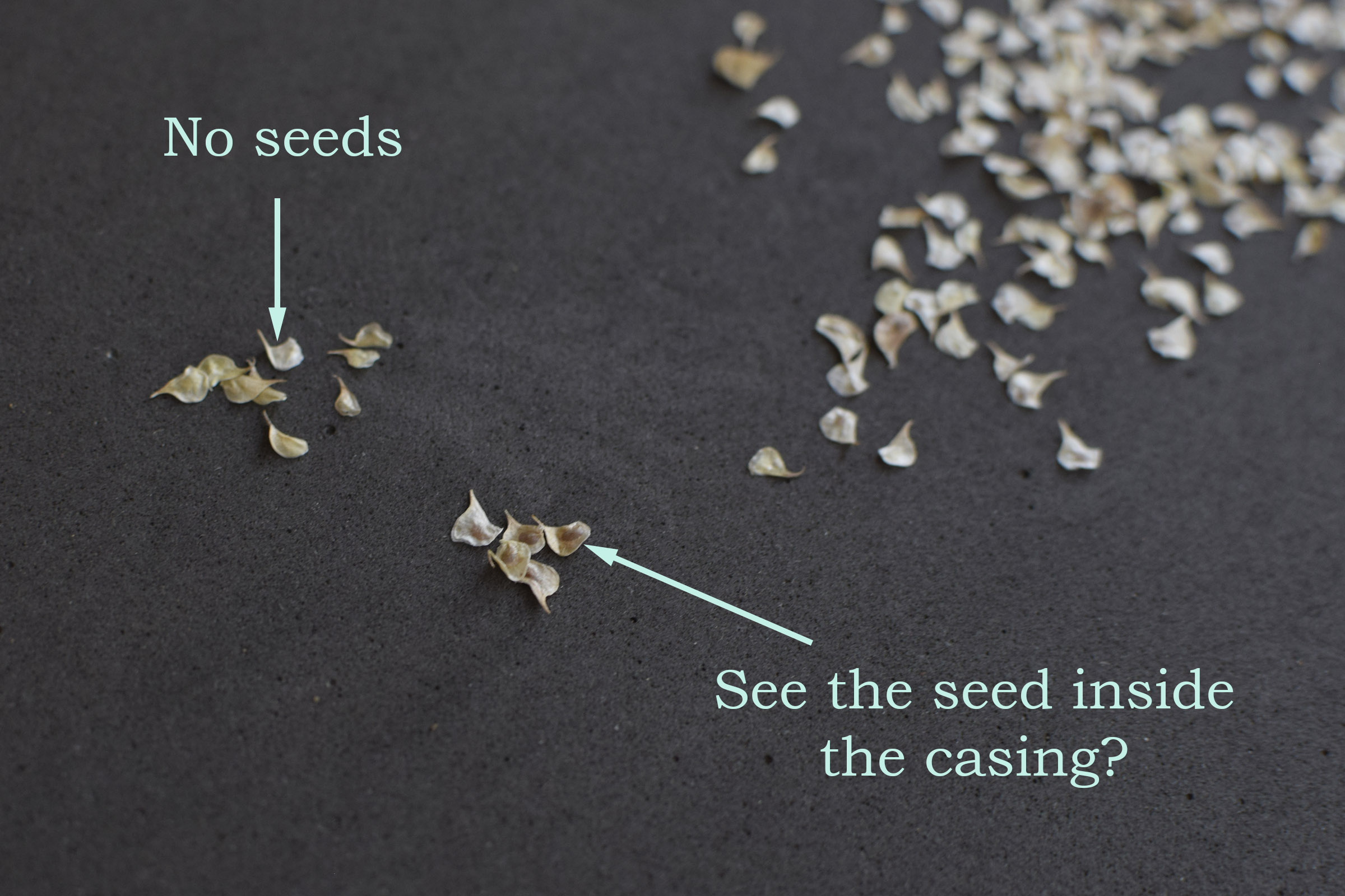 To save ranunculus seeds, simply set aside any flake that has a tiny dark spec in it; no need to remove it from the casing at all before germinating.