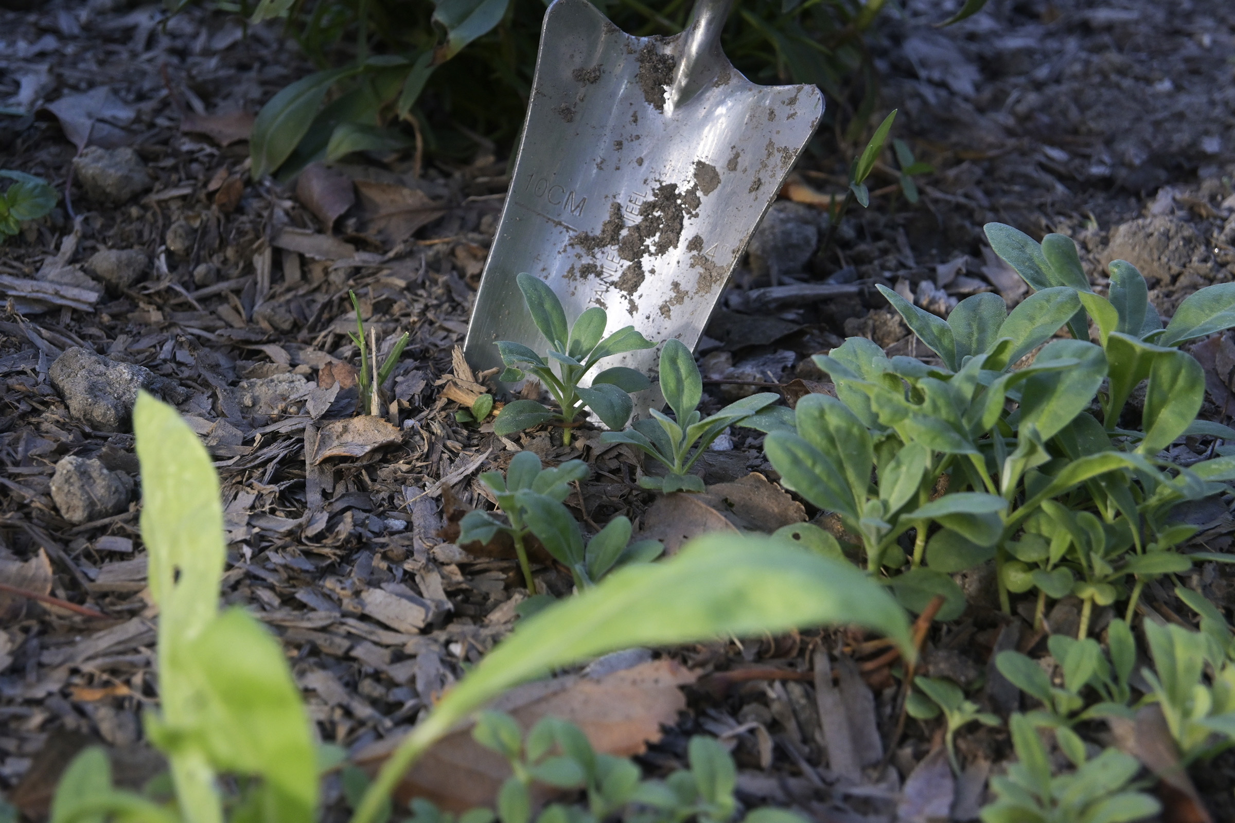 To transplant a volunteer plant in the garden, I simply take a pointy hand shovel (like this one) and dig around the baby plant. The goal is to get the whole “root ball” and minimize root disturbance.