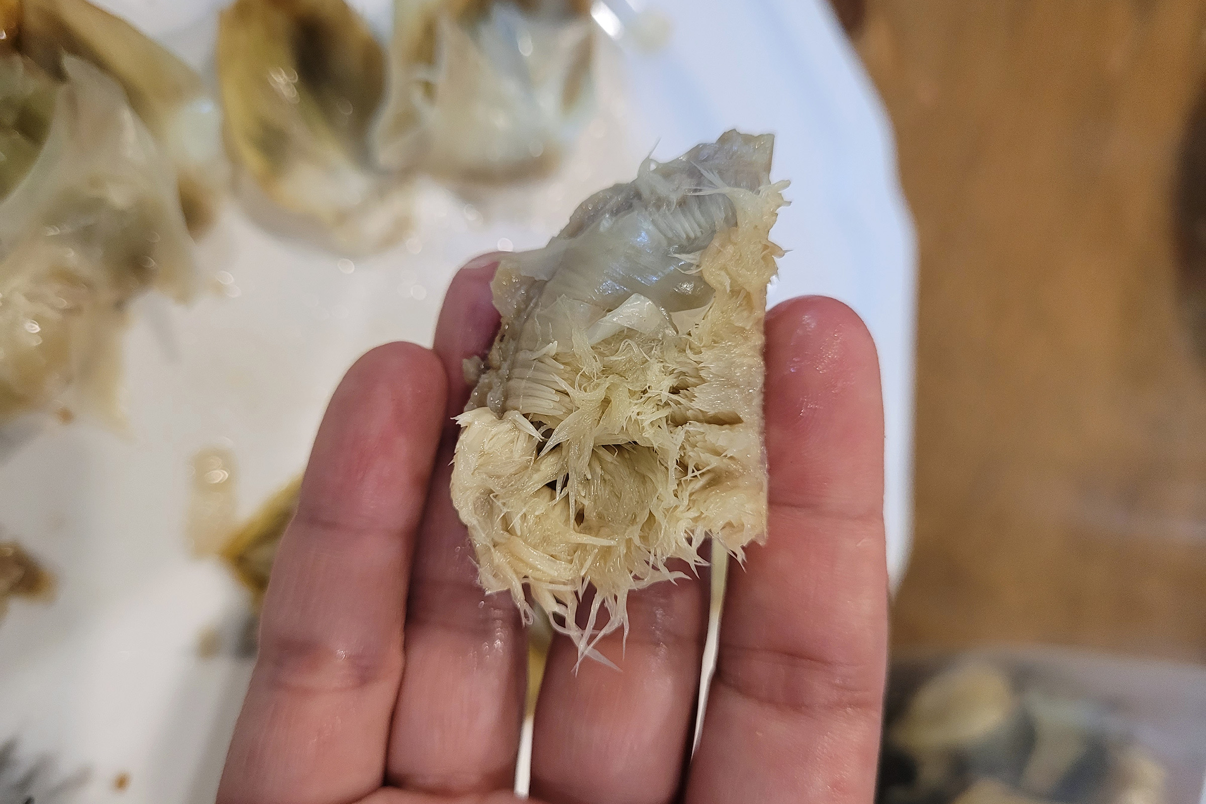 Once you have peeled off all the leaves you can start to unveil the artichoke heart! You’ll see a part in the middle of the artichoke that looks fuzzy—-this is the choke—and you can simply scrape or spoon the choke off and discard it. After removing the choke, you are left with the artichoke heart! The artichoke heart is so tender and delicious!