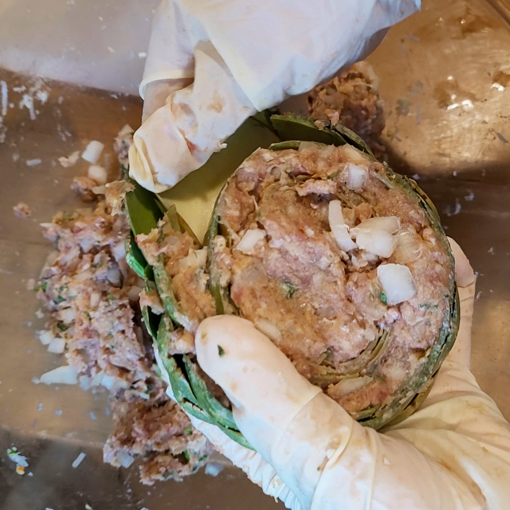 I made this recipe using 3 large globe artichokes. I had enough leftover stuffing to create about 15 meatballs for Italian Wedding Soup the next day.