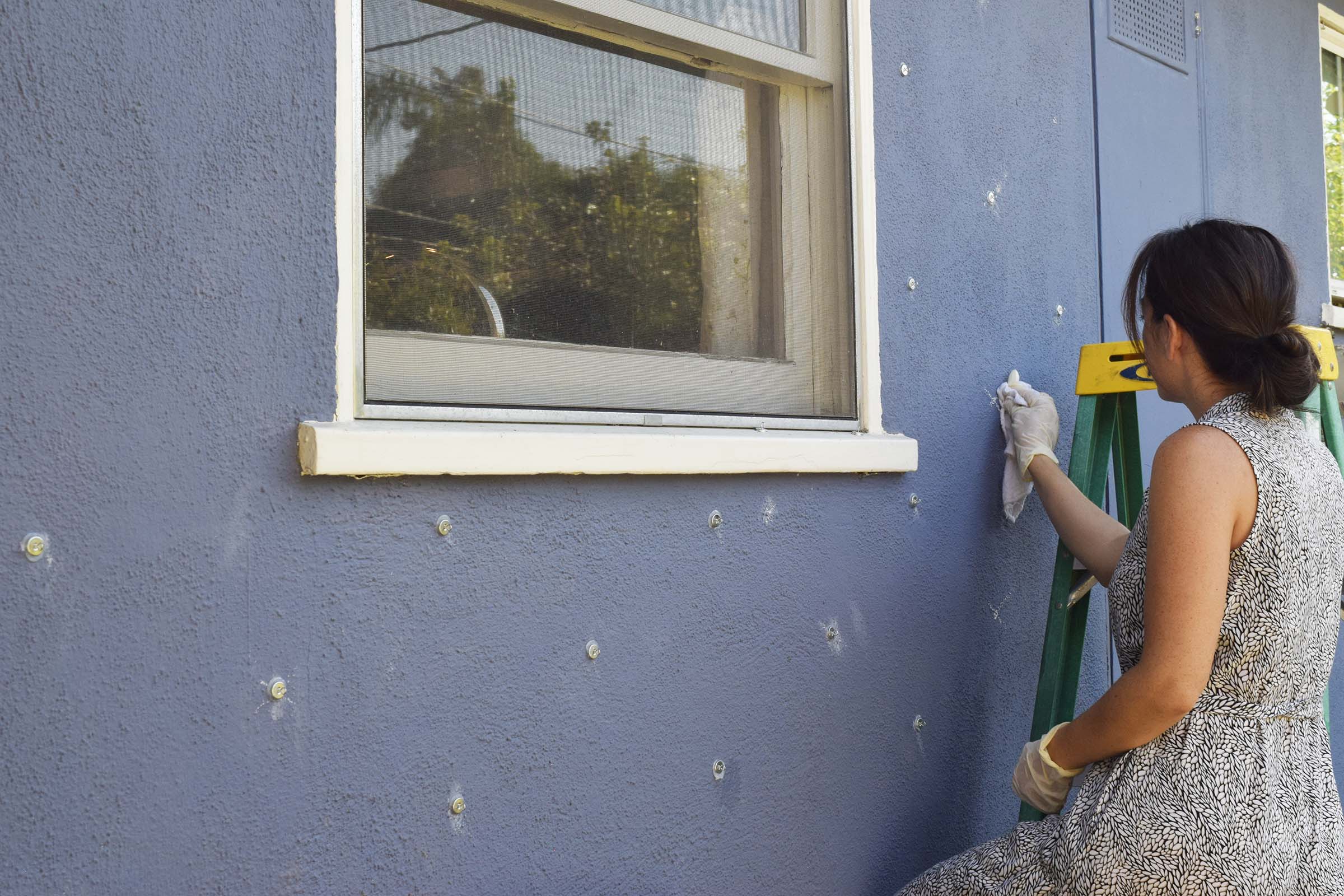 Once you’re happy with the layout of your chalk points, it’s time to glue the caps to the stucco wall!