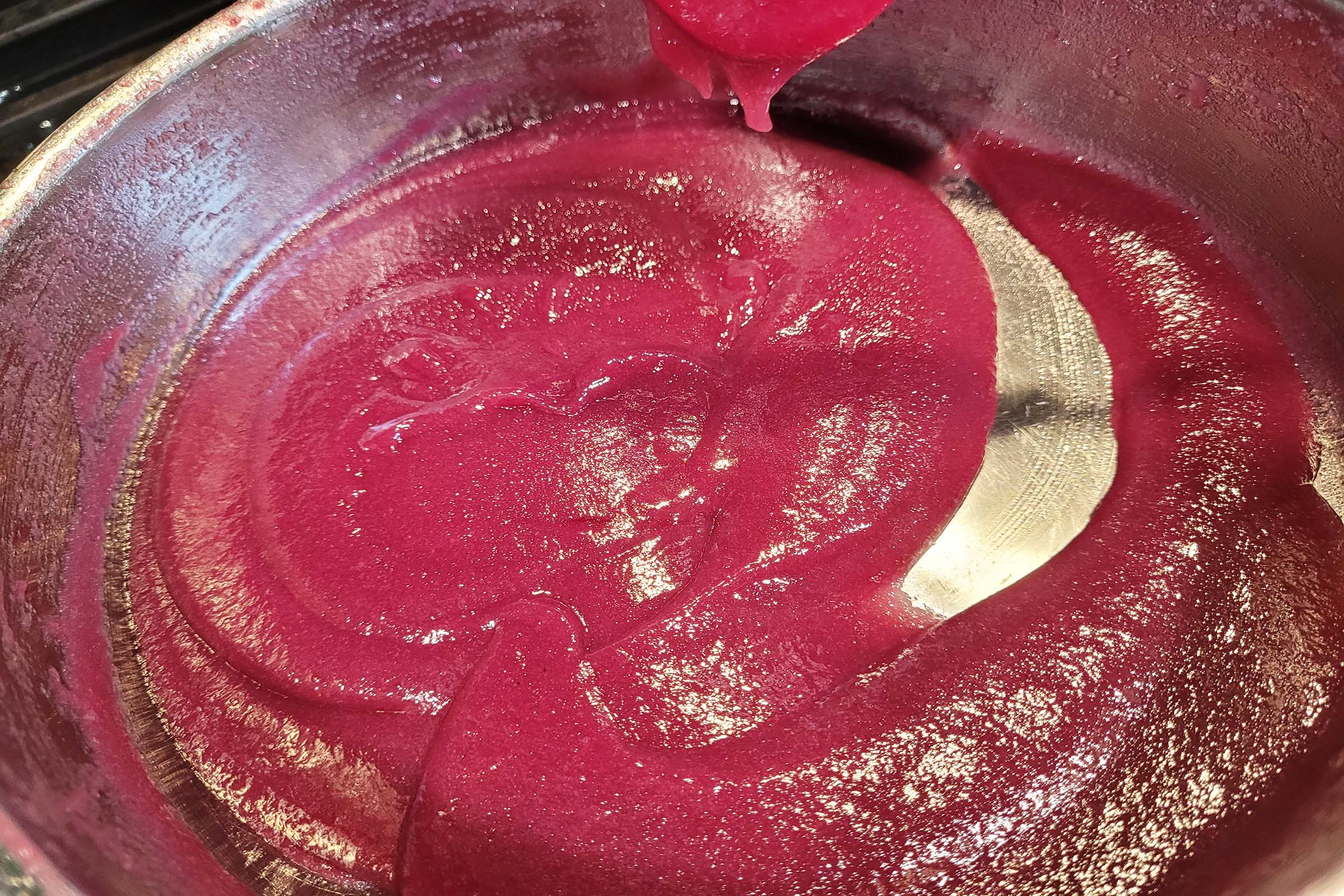 STIR often and don’t leave your pot on the stove! Continue to simmer your guava paste mixture on the stove. Ideally, you need to keep cooking and stirring until the mixture is so thick that you can draw a line on the bottom of the pan with your spoon and it doesn’t fill in…..and if you aren’t sure, keep cooking! The first time I made this I didn’t cook the mixture enough and it didn’t set properly. Definitely plan for about an hour of cooking!