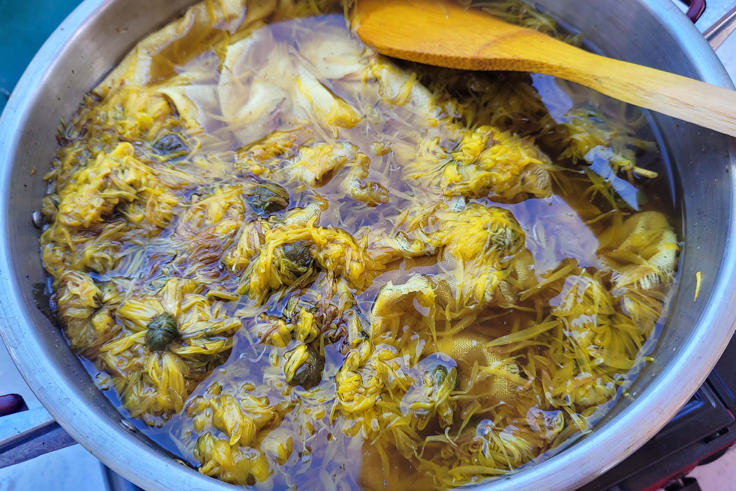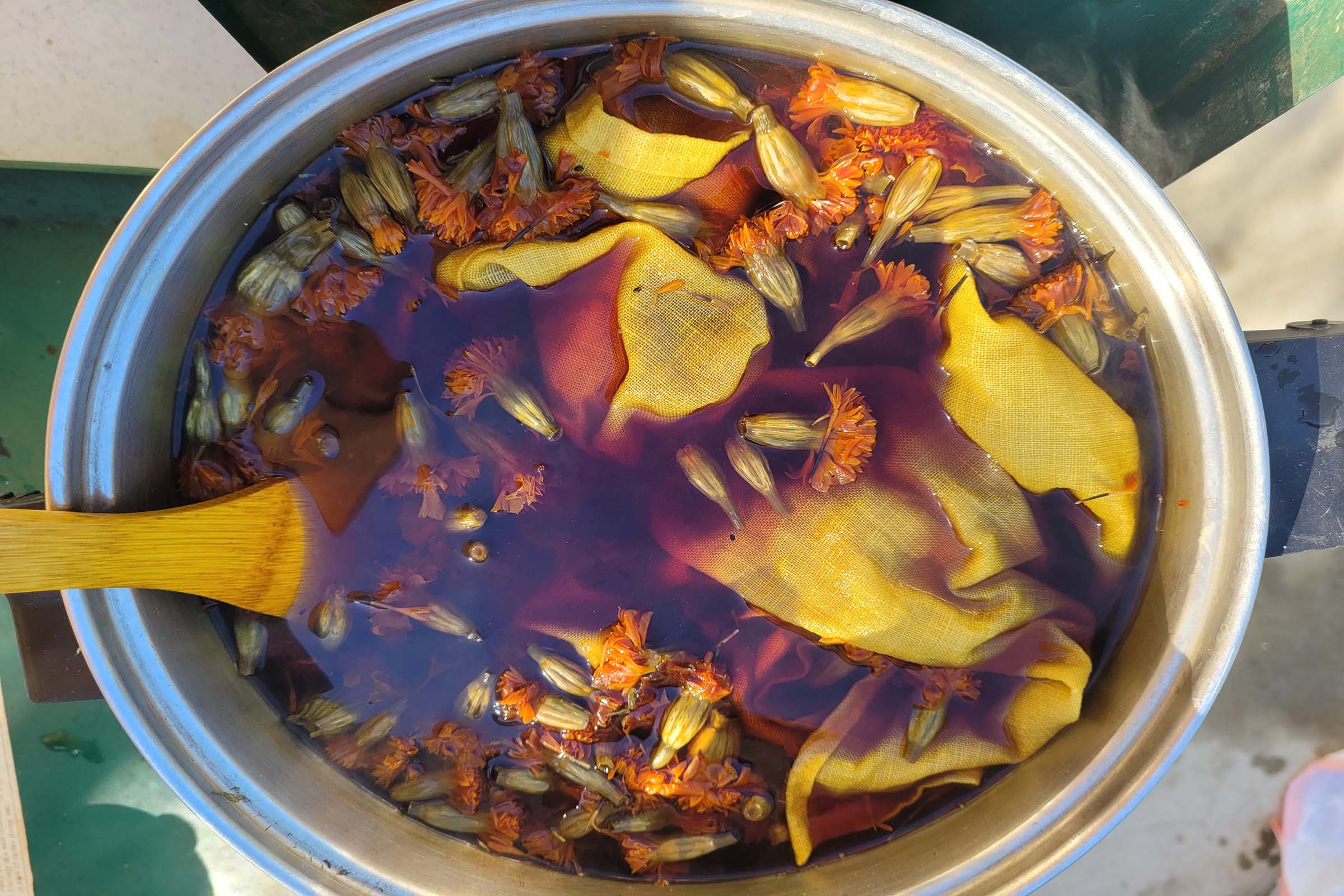 One of my goals for these naturally dyed linen napkins was to only use locally foraged or homegrown plant material to create the colors. As home gardeners, we know how exciting it is to create dishes or projects from things we have grown ourselves, right? For this project, I grew marigolds in my garden because they are one of the most incredible sources of yellow dye. Additionally, between local friends and I, we managed to accumulate black walnuts, eucalyptus bark, dried hibiscus flowers, and tea chrysanthemums. As a last minute addition, I decided to do some experimenting with loquat leaves and bark as well. Spoiler: the loquat dyes are currently my favorite and I plan to experiment a lot more with it. In the end, we played with around eight different natural dyes!