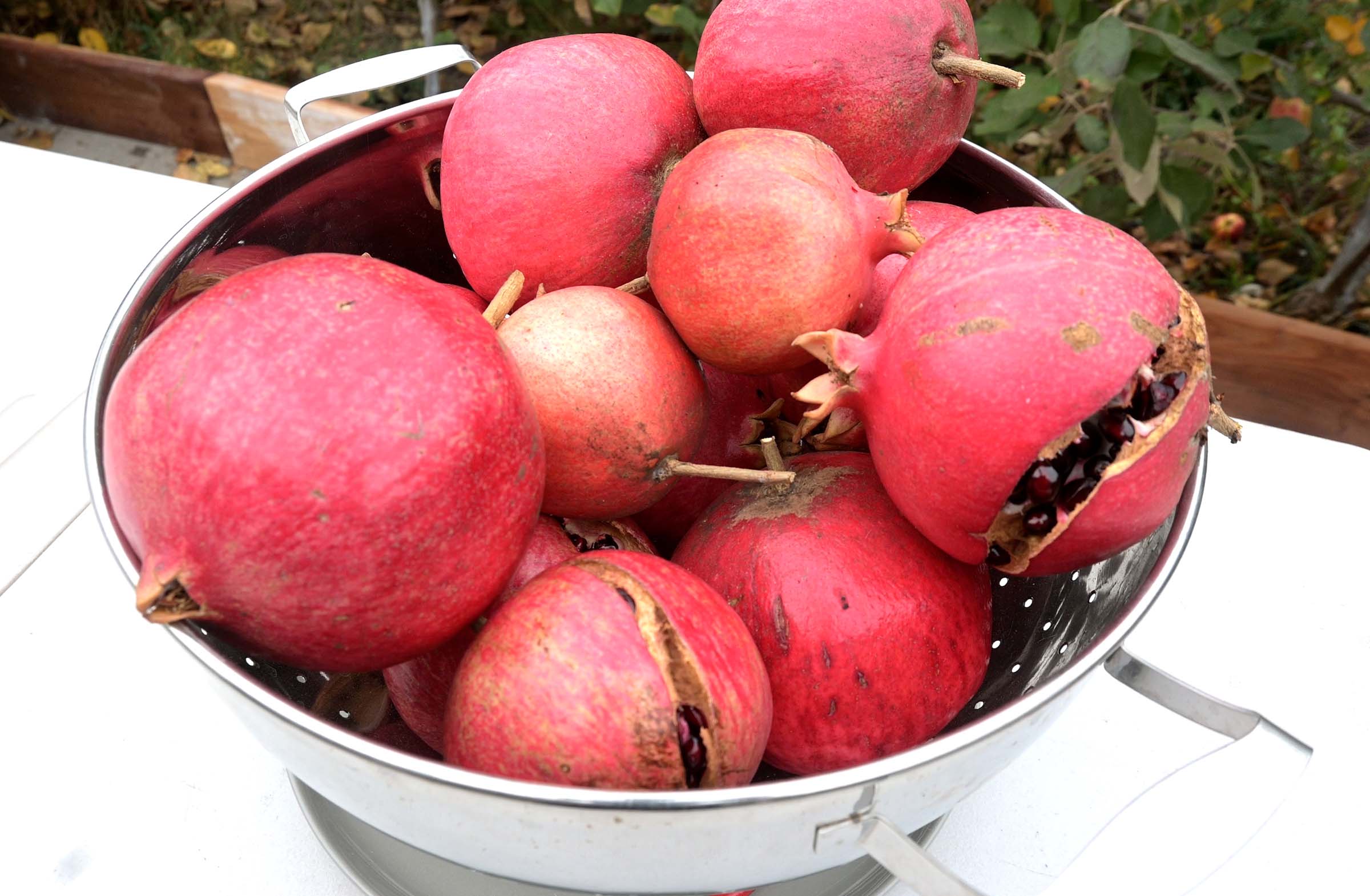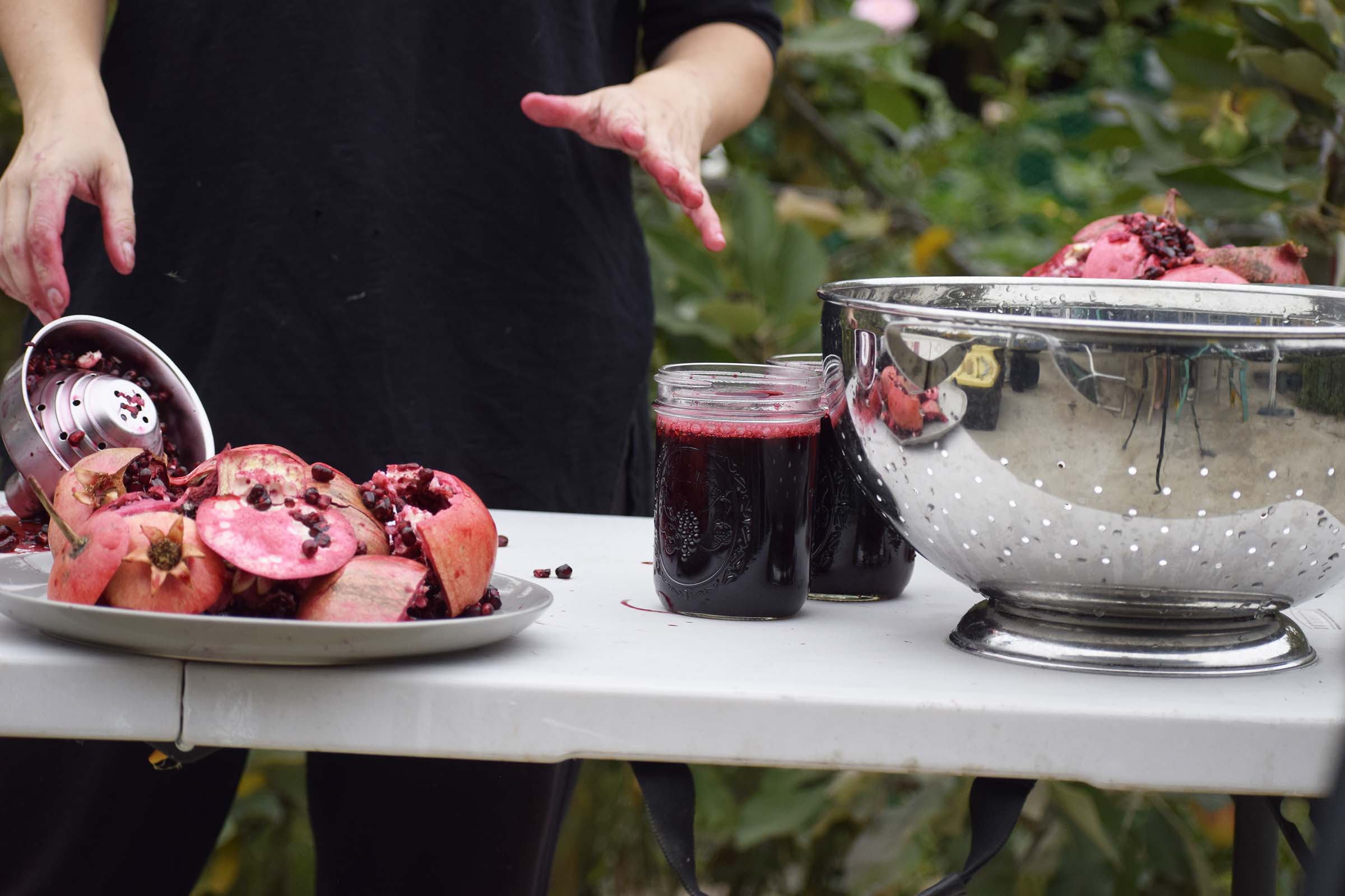 The first step to making homemade pomegranate molasses is to get pomegranate juice. And yes, you can buy juice from the store, but you all know that garden-to-table is what I like to share and write about! Our beloved ‘wonderful’ pomegranate tree produces giant fruits that we use in a multitude of ways. If it’s early in the season, I like to remove the juicy arils (here’s my video how-to) and simply eat them as snacks with a spoon or toss into salads. As our tummies get their fill of pomegranate arils, I turn to other methods of preserving pomegranates—-mainly juicing and freezing the juice for future uses. Furthermore, now that I know the glory of pomegranate molasses, I’ll definitely be saving some juice to make molasses every year.