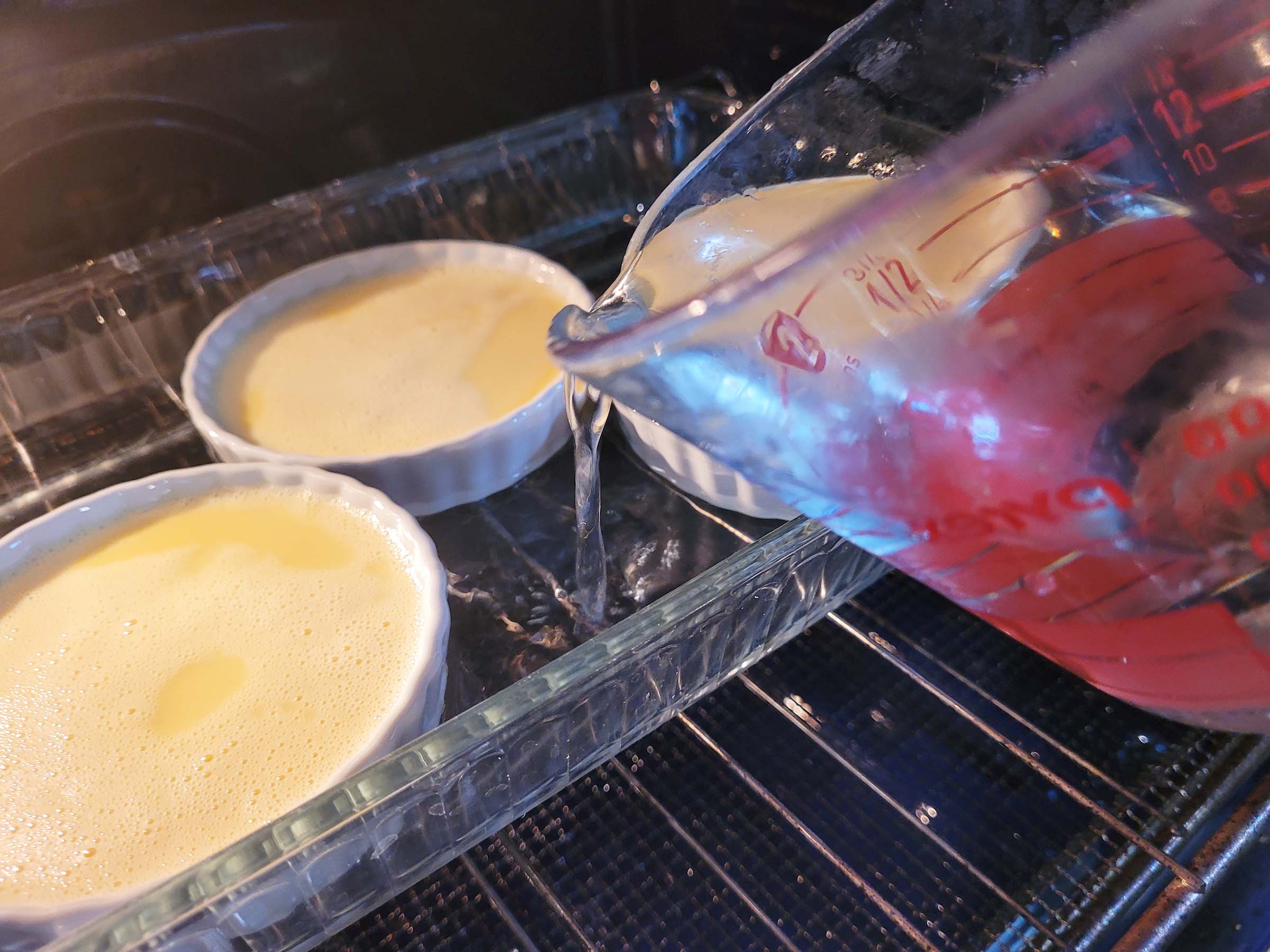 Next, take your hot water and gently pour it into the baking dish AROUND the ramekins. You want the water level to be about halfway up the sides of the ramekins.