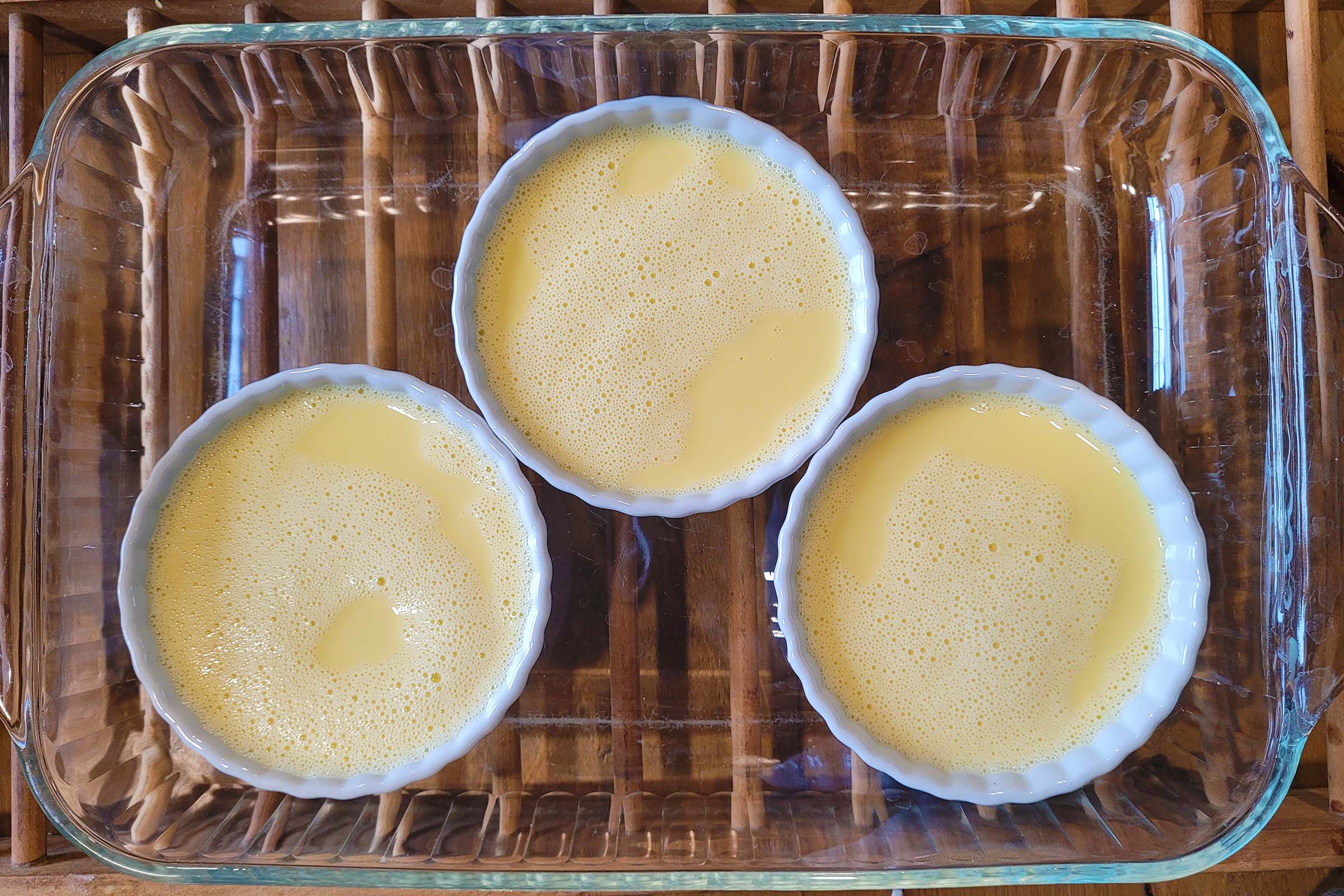 Take a shallow baking dish and place each ramekin in to see if it fits and sits flat. Next, fill each ramekin evenly with your cream/custard mixture using a ladle or spoon.