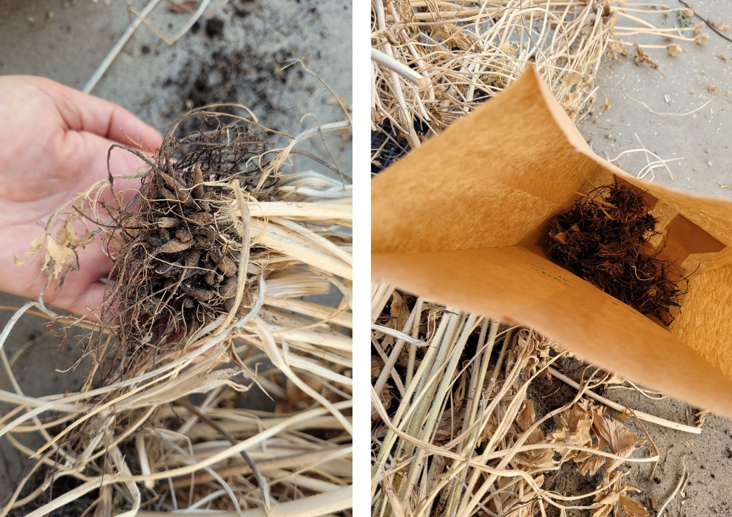 Take your bundles of plants and lay them in a dark and dry place, like a garage, to completely dry out. Of course, we want dried but not withered. Once everything seems completely dry, you can snip off the stems and collect your corms in a paper bag. My paper bag of corms went into a bedroom closet and stayed nice and dry until Fall planting time!