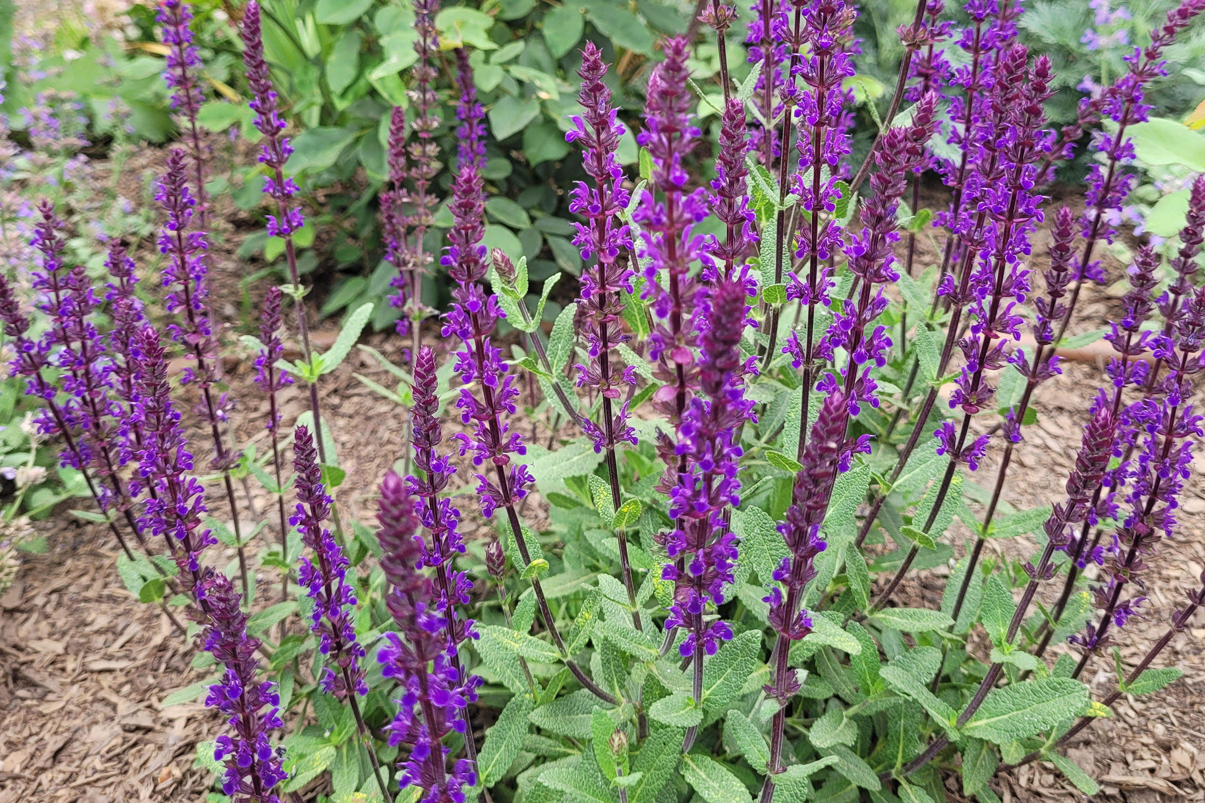 Another great salvia is salvia officinalis, better known as culinary sage. Specifically, culinary sage is an amazing border plant. It’s grey-green foliage can be a beautiful contrast to rose foliage and, of course, you can eat it! I’ve had a stunning specimen of ‘berggarten’ sage in my garden for many years. In fact, it blooms about once a year with pretty purple flowers that are a favorite of hummingbirds.