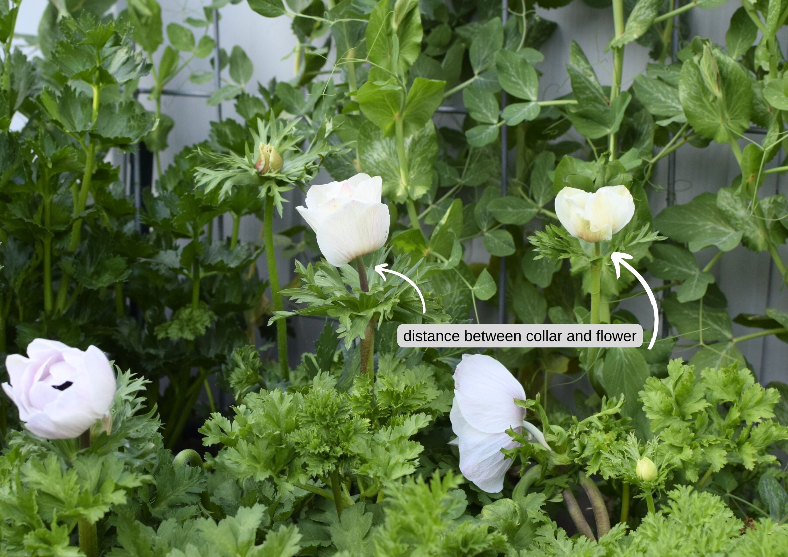 See, you’ll know it is time to cut/harvest/pick your anemone flowers when the distance between the frilly collar and the flower is about one-fourth an inch (1/4″). See the diagram below for a visual. One fun fact about anemones is that they will continue to grow taller in the vase. In fact, when I use to do flower arrangements, we would purposely cut the anemone stems just a tad shorter than the rest of the flowers because we knew, in the days before the event, that the flowers would end up poking out of the arrangements.