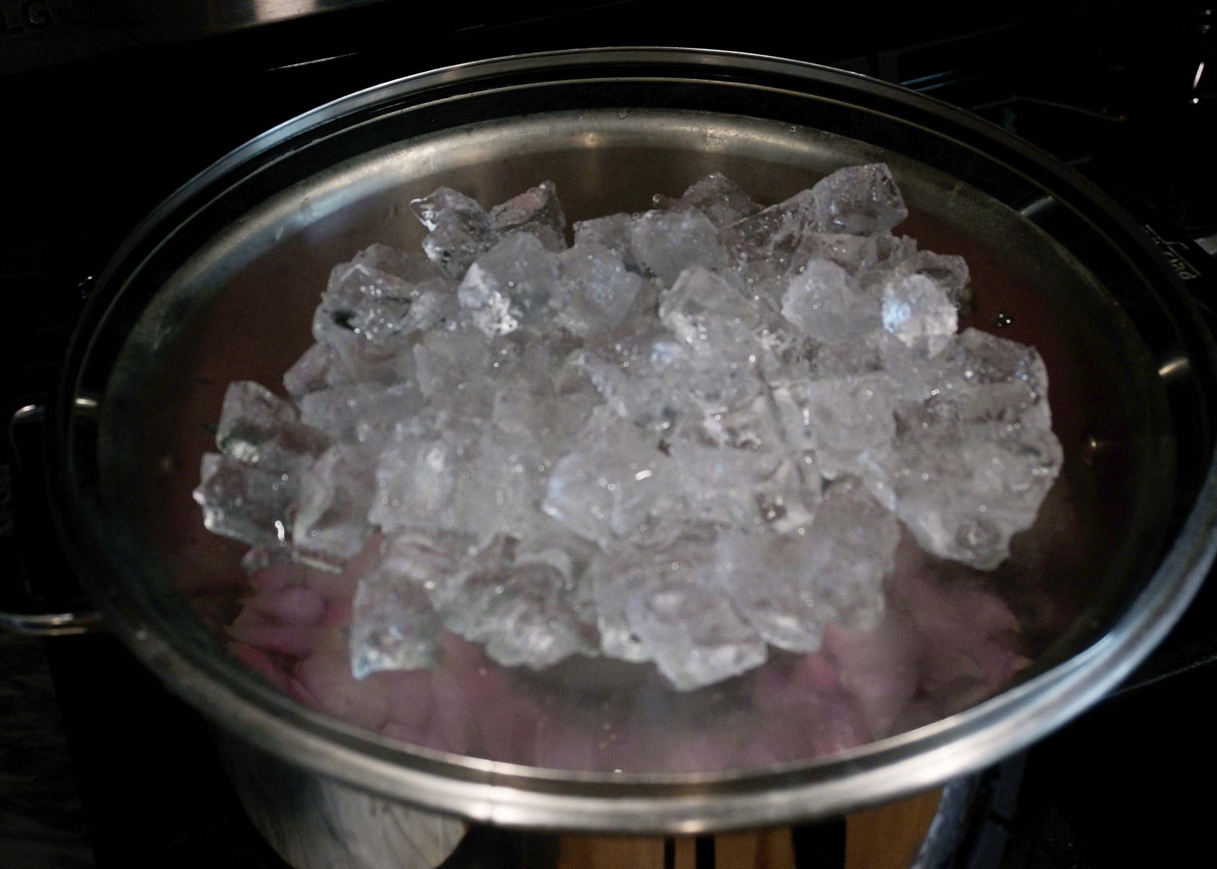 As the process continues, you’ll notice the ice on top of the lid starts to melt. At this time, take your large spoon and scoop out the melted ice water. Also, add more ice as needed.